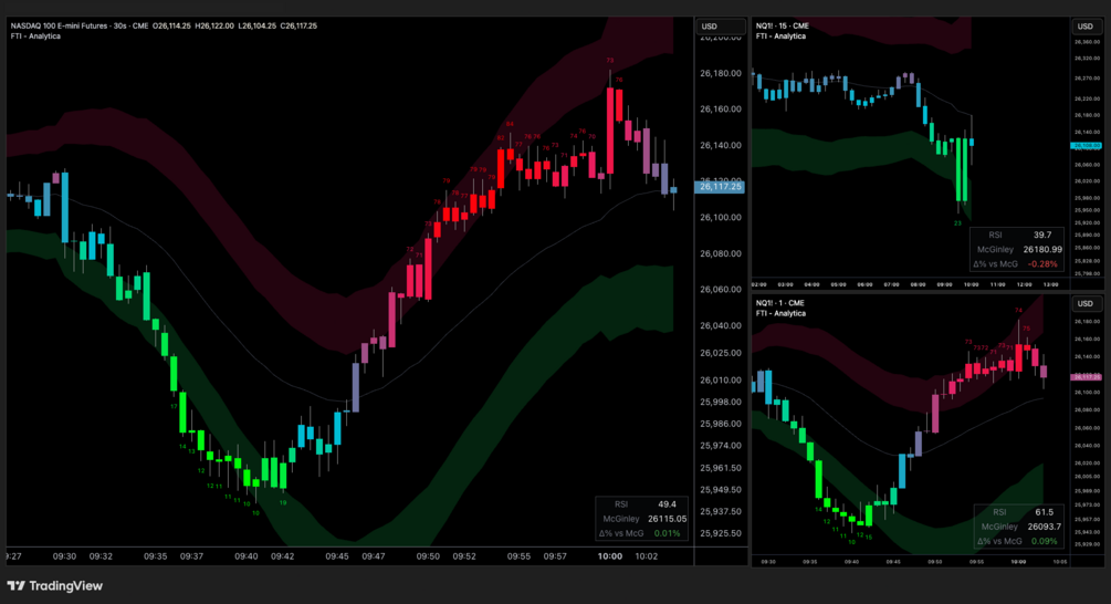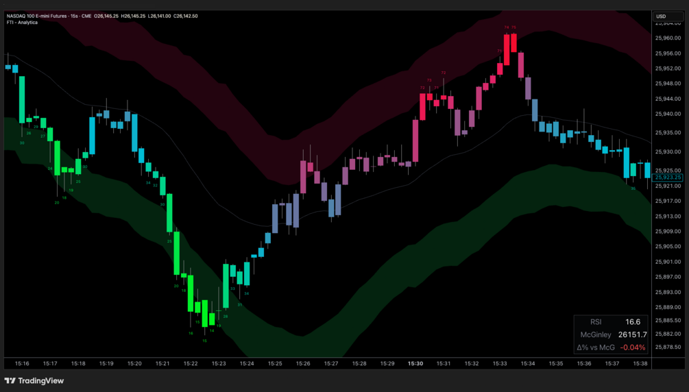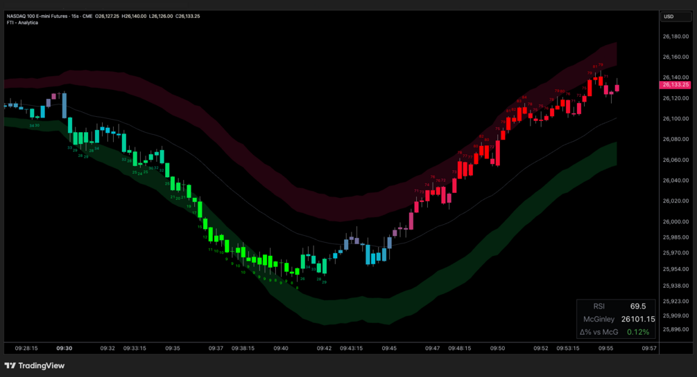 — Live RSI values, McGinley levels, and % deviation from trend, giving you analytical clarity that visuals alone can’t provide.