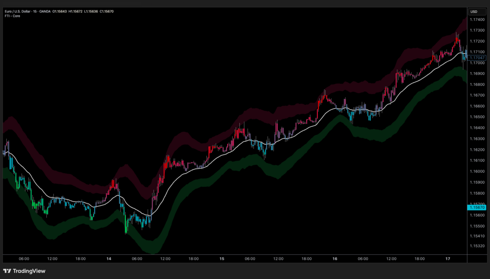 By multiplying ATR by Fibonacci ratios and offsetting them from a moving average, FTI-Core builds a volatility envelope that expands and contracts with genuine market energy.